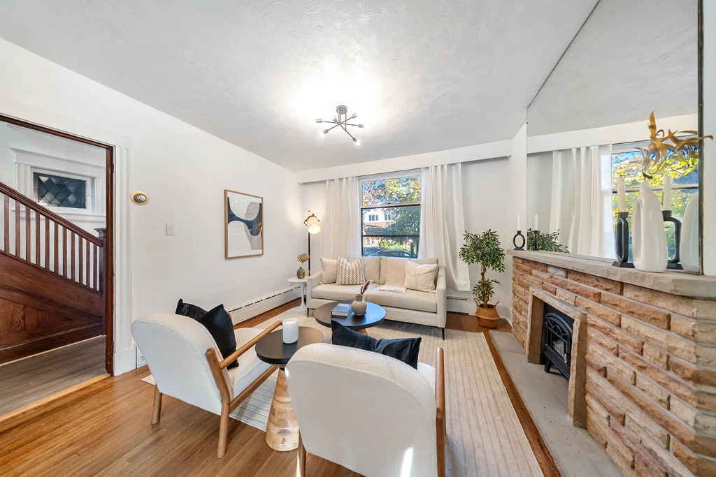 Inside, you’ll find a bright and inviting layout showcasing original millwork, moldings, and hardwood floors that highlight the home’s enduring charm. The newly renovated kitchen features quartz countertops, modern cabinetry, and stylish finishes, while the updated bathroom includes a marble shower/bath and quartz vanity, adding a touch of everyday luxury. The living room features an original stone wood-burning fireplace, currently fitted with an electrical insert for cozy gatherings, yet easily converted back to a traditional wood-burning fireplace. Freshly painted throughout with updated electrical, this home is move-in ready yet still offers the opportunity to personalize. The renovated finished basement includes a separate rear walk up and a roughed-in kitchen, providing potential for an in-law suite or supplemental income.
